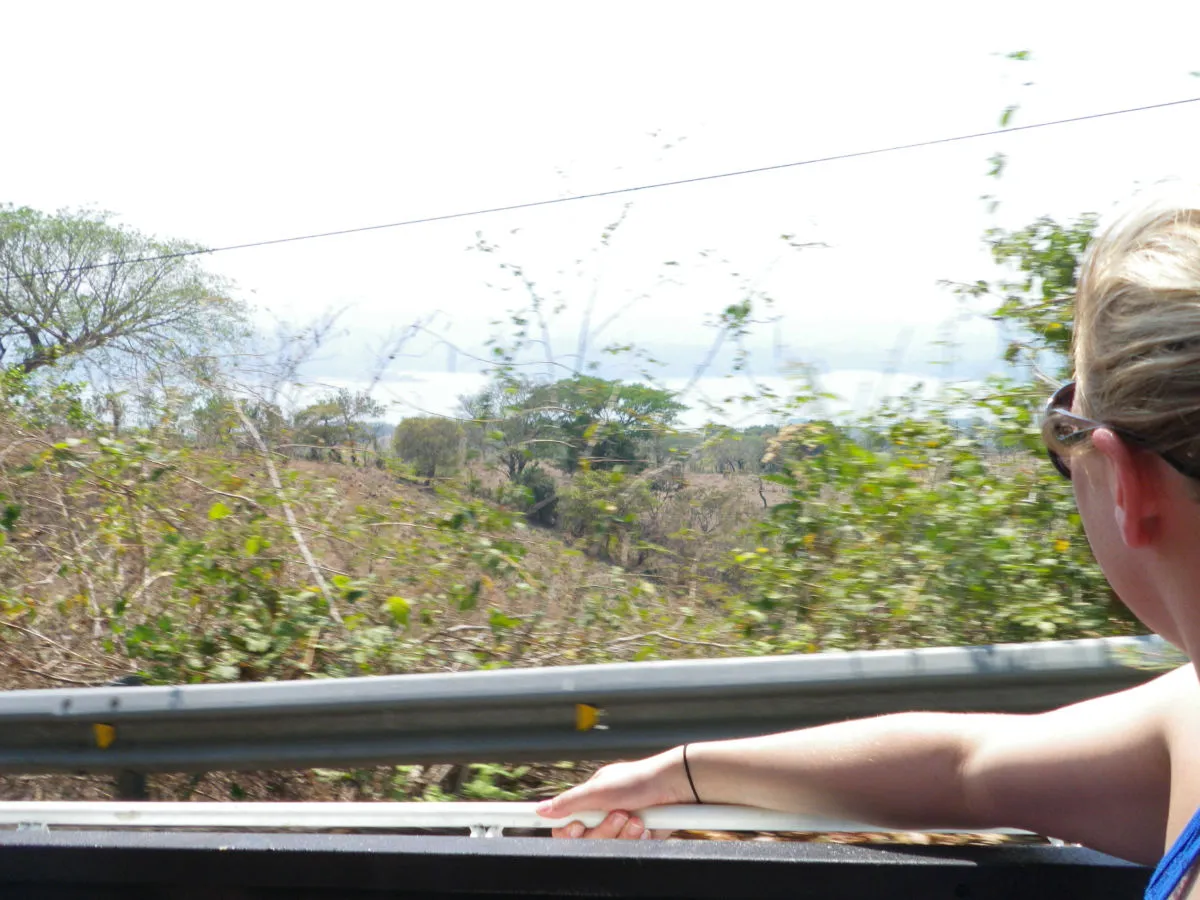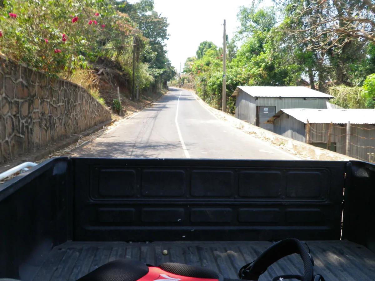 Arrivé de l’autre côté, ce n’est vraiment pas bien indiquer où l’on doit aller pour prendre le bus. On marche donc sous un soleil de plomb chargé de nos sacs. On atteint une intersection avec quelque chose qui pourrait faire office d’arrêt de bus, mais personnes pour nous confirmer… Ce plan nous semble trop incertain et on décide de continuer jusqu’au prochain village pour demander la direction. Pour rajouter au plaisir de la balade, toute la route est en pente raide. On trouve finalement de la vie et les direction pour prendre le bus et on attend patiamment sous le couvert d’un toit de tole. Après 30 min. une salvadorienne dans la 20aine, se joint à nous dans l’attente du bus qui ne semble jamais arriver. Notre nouvel amie se tanne et decide de demander à son oncle de la transporter au prochain village et à notre grande surprise, nous invite à monter avec elle! Seul problème c’est un pickup… Pas de place pour tout le monde, on monte donc directement dans la boite du pickup! Wow! quelle ride! c’est le meilleur moyen pour apprécier le paysage depuis les sinueuses routes de montagnes qui nous séparent du prochain village!