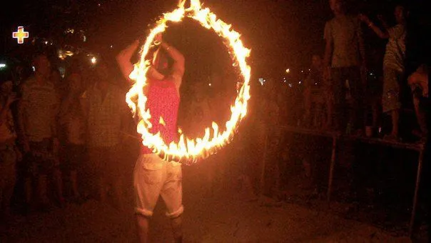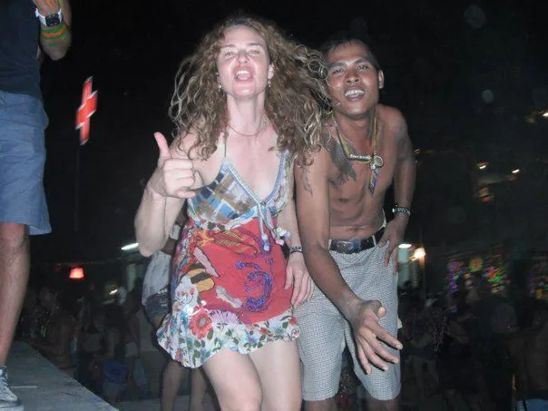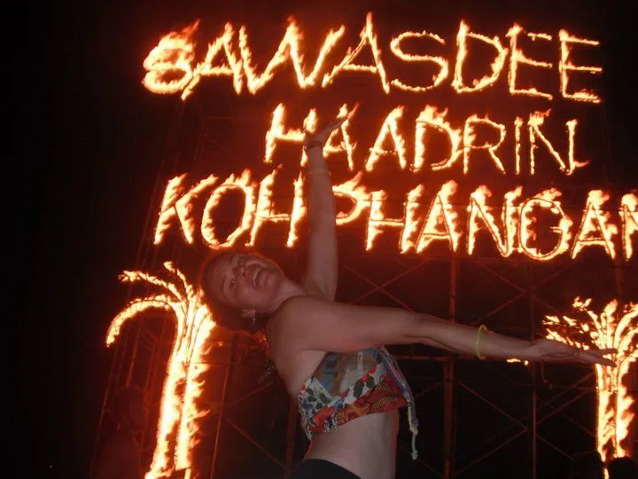 J’attrappe un bucket et un pilon de poulet frie et gogoggo for the beach!! Outch c’est fort mon bucket!!! Une pleine bouteille de 40% avec Redbull en prime! Arrivée sur la plage c’est le chaos! L’alcool coule à flow, la plage au complet est un gigantesque dance floor, la mer sert de pissoire pour tout le monde. C’est pas chic de voir une belle femme accroupie culotte baissée pour tenter d’uriner dans la mer et qui tombe dans l’eau, trop saoul pour garder l’équilibre. J’escalade une échelle de corde sur la façade d’un bar et débouche sur une glissade d’eau malade menant sur la plage. De retour sur mes pieds j’aperçois un long bâton en feu maintenu au dessus du sol par 2 thai, les touristes se bousculent pour faire du limbo en dessous! Plus loin un anneau de feu est aussi suspendu et plusieurs sautent dedans, suivi d’une corde à danser de feu! La plupart ressortent de la avec quelques jolies brûlures de guerre.