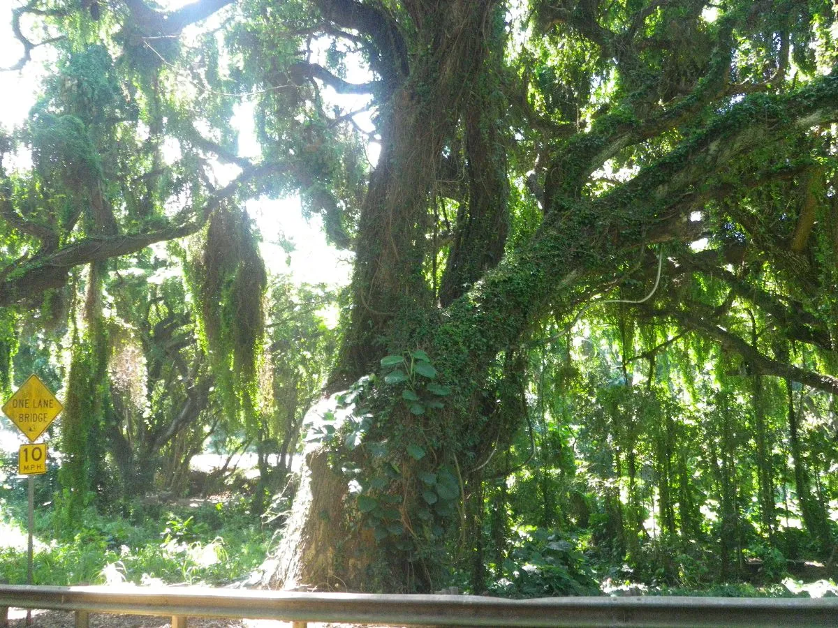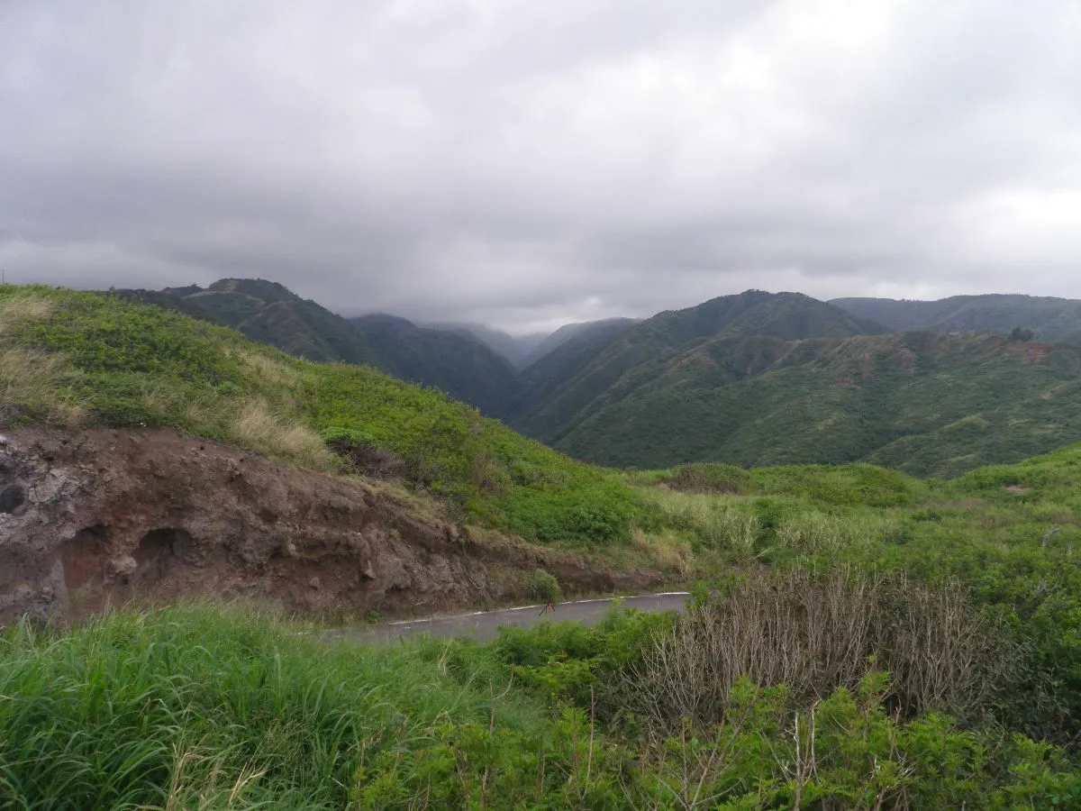 Pour la dernière journée de Daphné avec nous, on se cherchait une excursion à faire. On arrête notre choix sur Iao Needle, un parc enclavé entre les deux volcans de l’île, où il semble avoir un beau sentier menant à une chute. Et question de se donner la vie un peu plus dure, plutôt que de passer par les autoroutes (que notre GPS nous recommande fortement), on décide de prendre le chemin au nord de l’île.